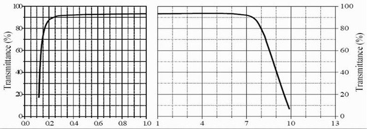 透过范围从真空紫外的130nm到远红外的9μm,氟化钙晶体被广泛应用于真空紫外到红外光谱中的窗口、透镜和棱角等光学器件中。由于具有低的吸收,氟化钙晶体也被应用于高功率激光光学中。在一般情况下,氟化钙的抛光表面非常稳定,可以使用很多年。此外,较低的折射率使得该晶体在没有防反射镀膜的情况下直接使用。